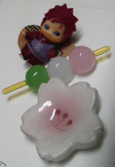 何故か有田焼のサクラ型箸置きと硝子のお団子箸置きと大阪から連れ帰った我愛羅QP